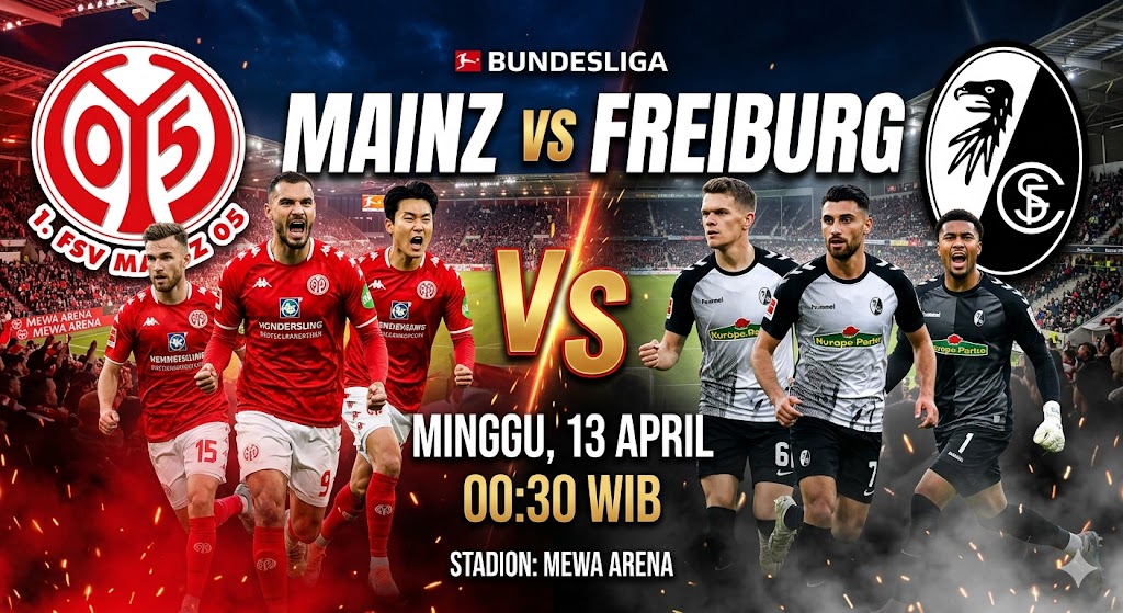 Pertandingan pekan ke-29 Bundesliga musim 2025/2026 akan menyajikan pertarungan sengit di MEWA ARENA saat tuan rumah Mainz 05 menjamu SC Freiburg pada Minggu, 12 April 2026 (Senin dini hari WIB) pukul 00:30 WIB. Mainz sedang dalam tren positif untuk menjauh dari zona degradasi, sementara Freiburg berusaha menjaga asa untuk menembus zona kompetisi Eropa.