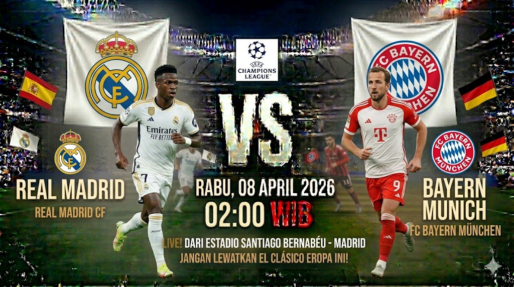 Pertandingan “El Clasico Eropa” antara Real Madrid dan Bayern Munich di babak Perempat Final Liga Champions (Leg 1) akan berlangsung di Santiago Bernabéu pada Rabu, 8 April 2026 pukul 02:00 WIB. Ini adalah pertemuan dua raksasa dengan sejarah paling kaya di kompetisi ini.