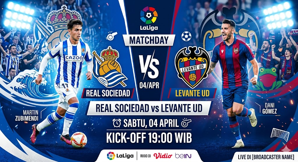 prediksi skor untuk pertandingan Real Sociedad vs Levante yang akan berlangsung pada 4 April 2026 pukul 19:00 WIB.