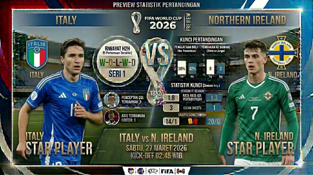 - Corner: Pasang OVER 9.5 Corner. Italia akan terus menekan dari sayap, menghasilkan banyak tendangan pojok karena bola sering dibuang oleh bek Irlandia Utara.